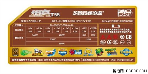 电源铭牌显示,超频三坦克T55豪华版额定功率为550W,并通过了80Plus铜牌认证,拥有不错的转换效率。它的四路+12V输出功率达492W,可以满足中端平台供电需求,感兴趣的朋友不妨继续关注。