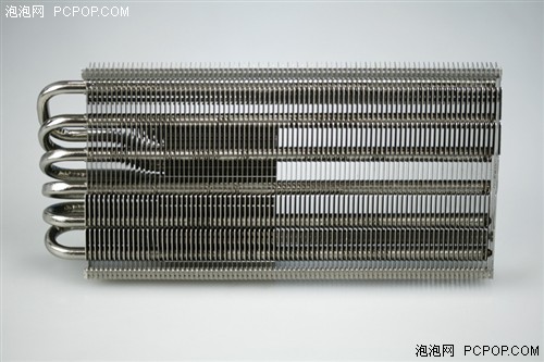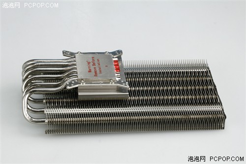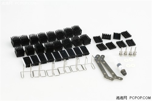 散热器的尺寸为212.5×110.5×65mm,有六根热管。鳍片与热管采用焊接工艺连接,导热效果很不错。因为是显卡散热器所以近来设计的很薄,看上去与Prolimatech的MK-13有些相似。配备了两款9.2cm风扇,以保证覆盖所有鳍片。从附件上可以看到附带了很多贴片式散热颗粒,足够各种显卡使用了。