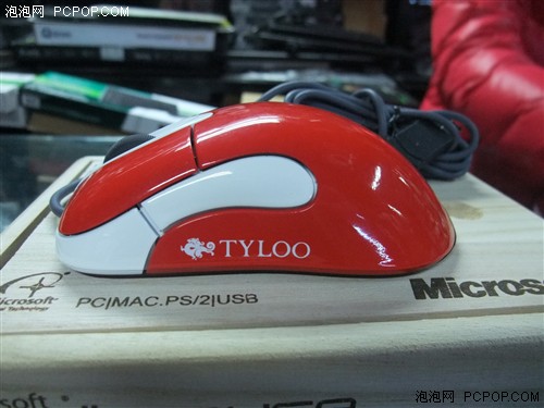 天禄版的微软IO1.1的表面使用了钢琴漆材质,显得光滑闪亮,并有着不错的质感。鼠标外观以红色为主,搭配了两个雪白的侧键,给人以强烈的对比,机身左侧和尾部还印有白色的天禄战队标志,以此来表明“身份”。