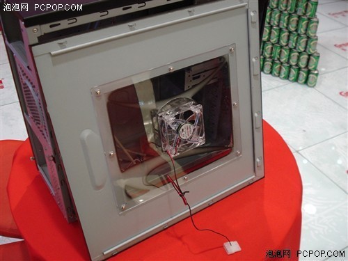 前置了4个USB接口、音频输出输入和一个1394口。侧面板采用亚克力材料做出了一个透明窗口,为了不影响散热加装可一颗风扇,在工作状态下有蓝色的LED灯点亮很是绚丽。
