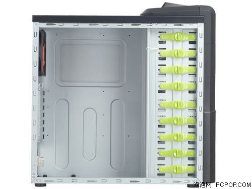 屠龙者提供了大量的机箱风扇位,侧板大面积开口能够支持多达4个的风扇安装,完全不用担心机箱内风量过少。略微凸起的侧板风扇位在保证进风同时还加强了高端CPU散热器安装的能力。