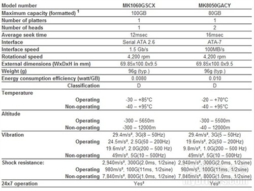 东芝存储设备部门今天发布了两款针对行业用户的2.5寸防振硬盘新品,分别是100GB容量SATA接口的MK1060GSCX,以及80GB PATA接口的MK8050GACY,专门为在恶劣环境下工作设计。