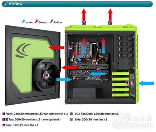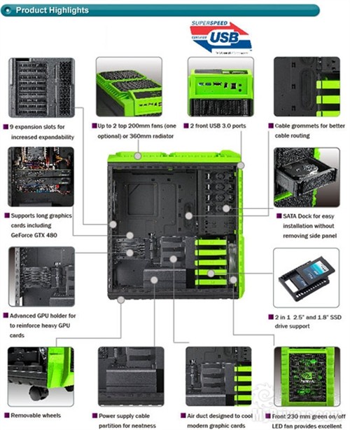 不过除了换肤,这款全高塔式在规格方面就没什么变化了:钢板机身加工程塑料,尺寸599×550×230毫米,净重14.35公斤,支持Micro ATX、ATX、E-ATX、XL-ATX等规格主板,电源下置,内有六个5.25寸驱动位(其中两个可转为2.5/3.5寸SATA硬盘位)、五个隐藏式3.5寸驱动位(支持1.8/2.5寸固态硬盘二合一)、九个扩展插槽位,系统风扇标配有前置23厘米(可开关红色LED)、后置14厘米、侧板20厘米、顶置20厘米两个,可选显卡支架8厘米、显卡导风槽12厘米,输入输出面板接口支持两个USB 3.0、两个USB 2.0、一个IEEE1394a、一个eSATA、一个耳机和一个麦克。