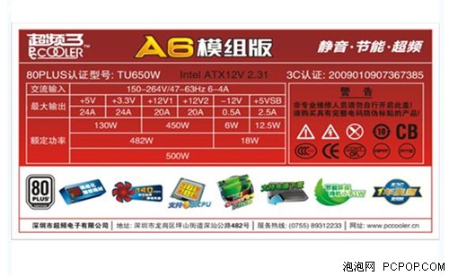 ATX12V 2.31版本规范,额定功率500W,双路12V每路限流20A,最大联合输出450W,可以达到总功率的90%。电源通过了80Plus白牌认证、节能方面表现出色。据超频三透露,这款电源的报价会让用户比较惊喜而且电源很快会上市,感兴趣的朋友不妨持续关注。