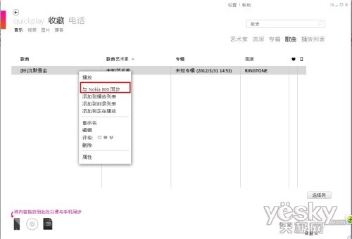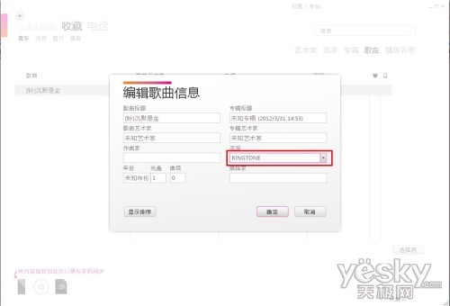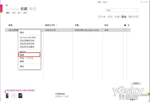 当文件导出后,我们将手机与ZUNE链接,本次我们使用的是诺基亚Lumia 800作为测试样机,在与ZUNE链接好后,我们将音乐文件导入ZUNE中,右键点击文件选择编辑,这里需要用户自己输入铃声的流派,如图所示,我们输入RINGTONE这项即可。