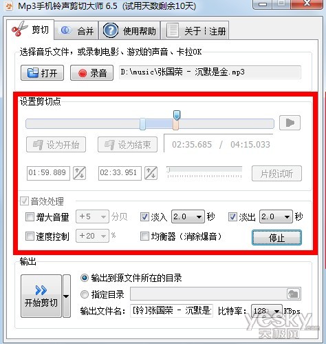 最后调整输出的目录 开始剪切一侧的下拉选项可以设置输出格式 我们选择MP3即可