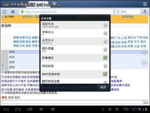 假如采用3G上网,那节省流量很有必要。这时可以关闭图片,或选择低彩模式,节省图片流量。同时启用WAP压缩中转,将网页经过浏览器的服务器压缩再发送给平板,节省整体流量。点击右上角的菜单键,在“菜单-设置工具-系统设置-浏览方式设置”里,将图片质量设置为无图,将“WAP压缩中转”后面的方框选中即可。
