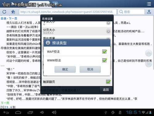 平板乃是看小说利器,不过载入下一章节的等待时间和滑动手指来翻页是很烦人的。解决的办法是在“菜单-设置工具-系统设置-浏览方式设置”里,点击“预读类型”,勾选“WAP预读”和“WWW预读”,再勾选“触屏翻页”。这样在你阅读当前页面时,浏览器会自动获取下一节内容,点击即瞬翻;点击页面的空白处,即可进行翻页,省去了滑动。