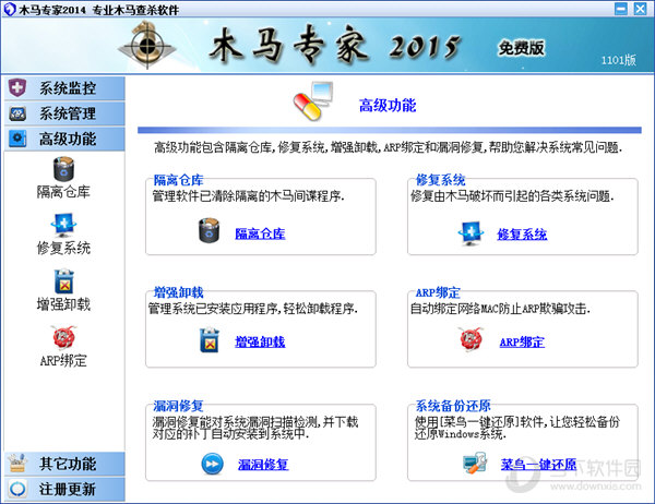 木马专家2015是一款专业又强大的的木马专杀工具,它可以查杀各种木马,也能检测出未知木马,会自动检测内存程序,一有非法程序出现就会处理,使用先进的内核查杀方式,可以自动脱壳查杀木马,同时软件还有网络入侵拦截,恶意网站拦截,ie修复,注册表备份,系统文件修复和系统进程管理等等。