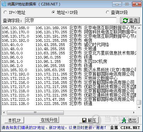 随数据库附送的查询程序(IP.EXE)具有在线检测并升级IP数据库的功能,只要运行该程序,点击右上角的“在线升级”,就可以升级IP数据库到最新的版本,无需再到下载网站下载新版的IP数据库。
