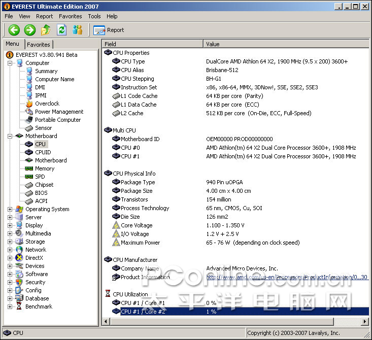 图片可点击放大 它与90nm Athlon64 3600+ X2处理器的不同在于,CPUID已经由0x40FB2,改变为0x60FB1。核心代号方面,已由上一个90nm版本的“Windor”更新至现时65nm版本的“Brisbane”,核心的Revision则由原来的“BH-F2”更新至现时的“BH-G1”。另外,VID的默认核心电压方面,检测结果为1.3V(CPU-z显示的结果是针对监控芯片实际返回的数据)。 [url=http://www.pconline.com.cn/images/html/viewpic_pconline.htm? [/url]