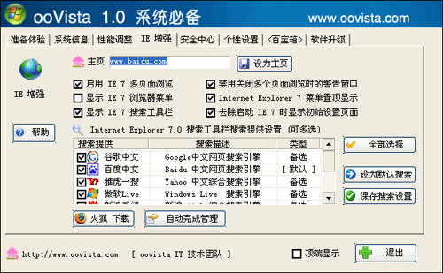 ooVista系统必备是针对Vista系统量身定做,同时又完全兼容Windows 2000/XP/2003系统的免费绿色增强调整工具。