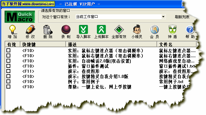 主要功能包括:1.定义一个热键,实现一系列的键盘按键动作、鼠标点击动作、鼠标移动动作、输入字符串动作、延迟动作。更多的插入动作以后也会扩充。2.实现动作的循环,每个动作都可以进行循环,你可以定义热键中止动作的循环,也可以自己定义循环的次数或者循环的时间。3.所有的热键都可以对指定的窗口有效,这样就不会出现切换了窗口还自动执行动作的情况。4.每个热键的动作都生成一个Script文件,高手可以自己编辑这个文件,实现功能强大的宏键。