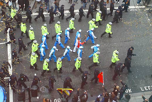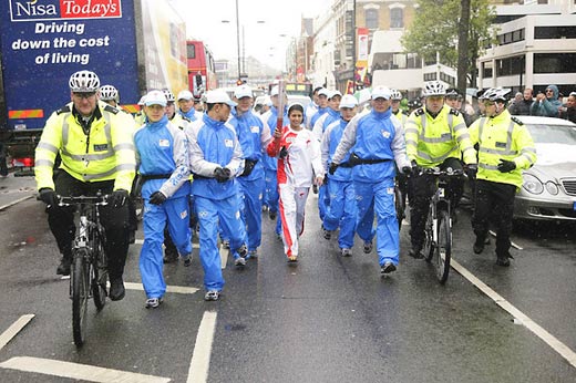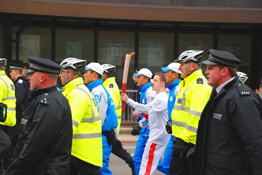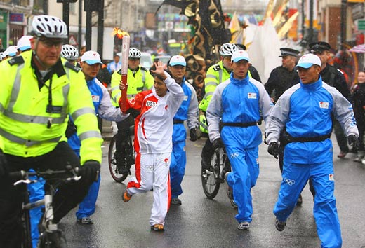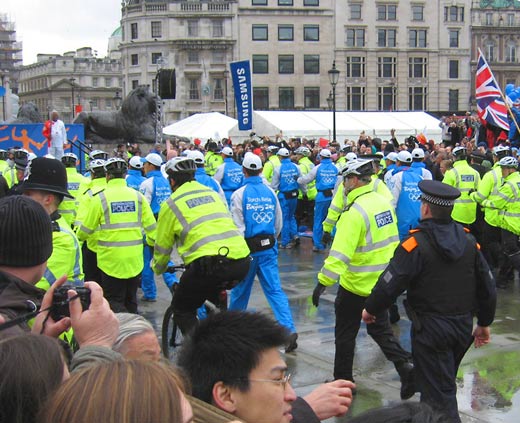 4月6日在伦敦举行的圣火传递仪式,中国武警圣火护卫团队(身着蓝色服装者)在内圈,伦敦当地警察(身着绿黄色荧光衣者)在中圈,外围则由穿上防弹衣的英国特警守护