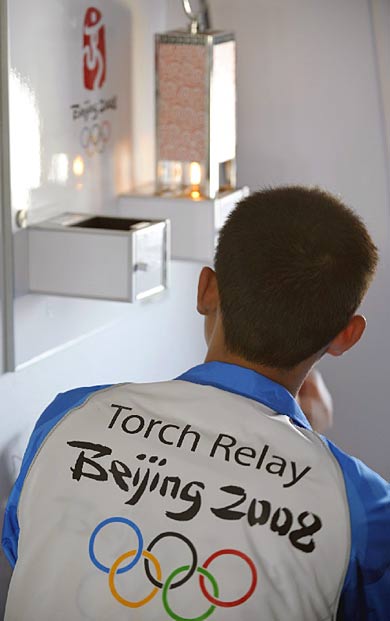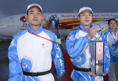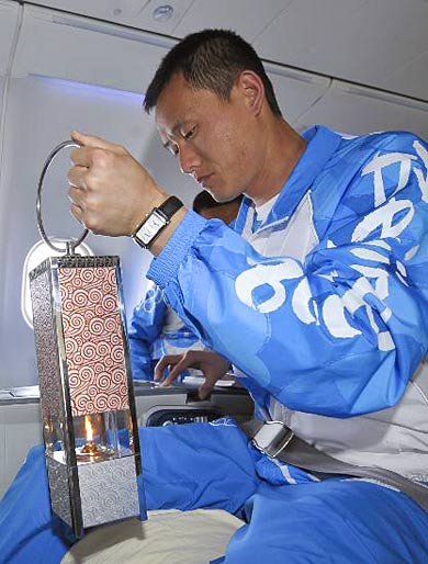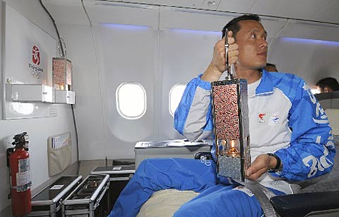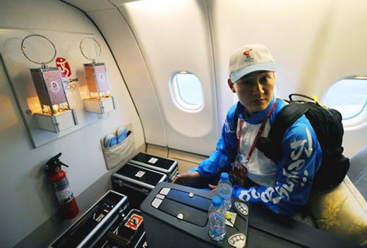 3月31日,2008年*圣火抵达北京。这是圣火护卫手陈杰手持圣火灯在运送圣火的专机上。