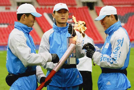 4月6日,北京*圣火传递活动在英国伦敦举行,这是北京*圣火境外传递的第四站。图为圣火护卫队点燃火炬。