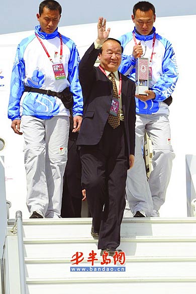 9时12分,专机舱门打开。中共中央政治局委员、北京市委书记、北京奥组委主席刘淇手持*圣火火种灯在机舱门口向欢迎人群挥手致意。刘淇手举火种灯,在国务院副秘书长、北京*火炬接力境内传递组织委员会主任项兆伦和希腊奥委会主席基里亚库的陪同下走下舷梯。