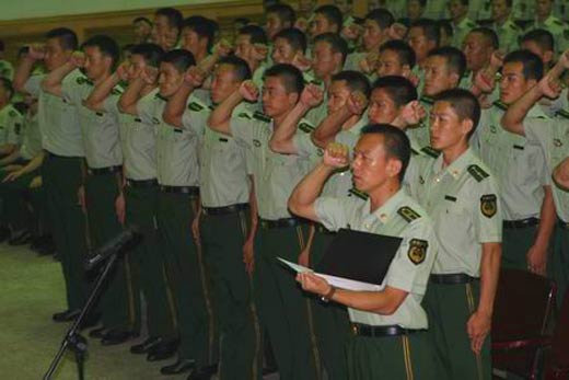 护卫团全体人员宣誓,可见除队长为少校外,其余人员均佩戴武警尉官军衔