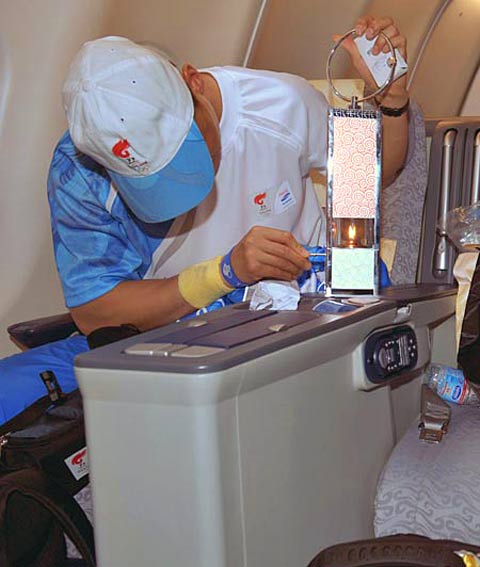 北京时间4月4日北京奥运圣火抵达圣彼得堡。在“奥运圣火号”专机上,一名圣火护卫队队员在检查火种灯。当日,北京奥运圣火到达此次环球火炬传递的第三站――圣彼得堡。