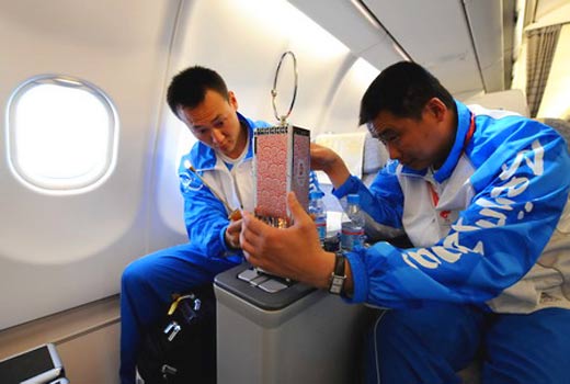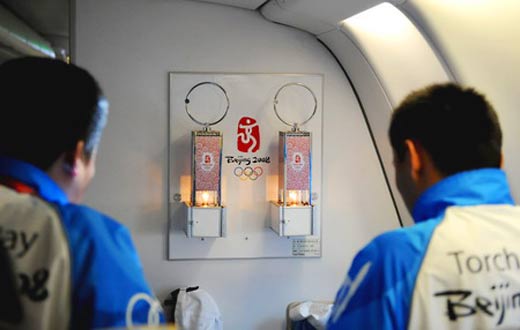 4月5日,两名圣火护卫手在专机上查看火种灯。在圣火灯前,一直轮流坐着两位护卫队员。这两位队员要始终注视着面前的圣火,一刻也不能走神。