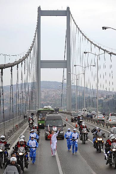 圣火传递在伊斯坦布尔,跨越亚欧两大洲分界——波斯普鲁斯海峡大桥