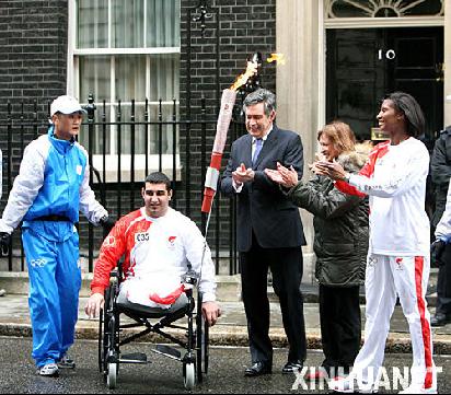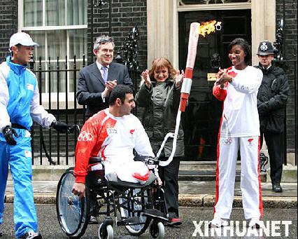 4月6日,在首相府前,英国首相布朗(左三)、英国奥运事务大臣特莎·乔维尔(左四)和第34棒火炬手、英国田径名将丹尼斯·刘易斯(右一)欢送第35棒火炬手阿里·贾瓦德。