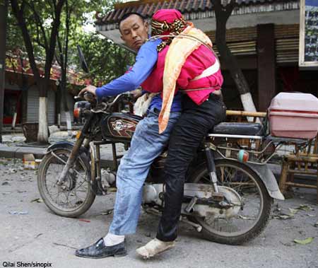在地震中痛失妻子的男子用绳子将妻子的尸体绑在背部,送她去太平间。在极大悲痛的折磨中,他努力要给予自己的妻子死后些许的尊严。但是在中国地震后的混乱中,这名男子坚持认为妻子不应该遗弃在那些尖利的碎石中。