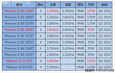 还有“Phenom II X6 1065T”,原始主频2.9GHz,Turbo Core加速频率3.3GHz,热设计功耗得益于制造工艺的进步而仅仅只有95W,非常适合希望兼顾高性能与低功耗的用户。