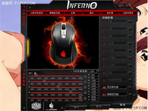 4000dpi 的分辨率,应该相当能满足一般使用者的需求。然后左边三行看不懂(遮脸),貌似仍有鼠标有记忆功能,可以带着配置文件跑。