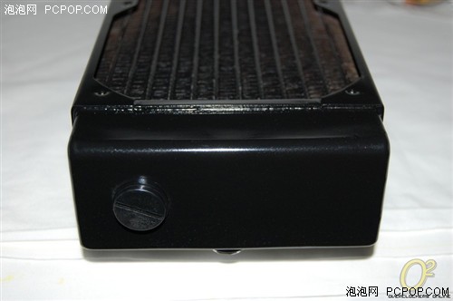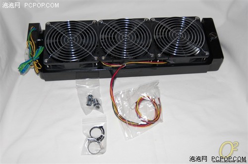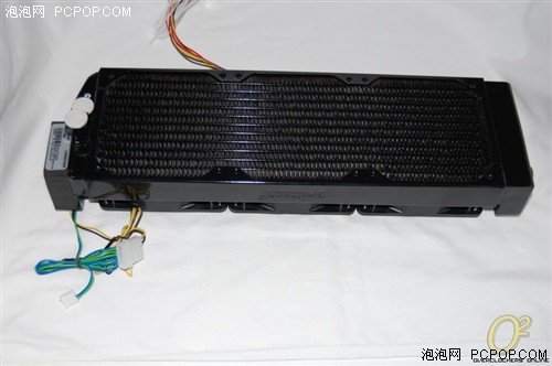 H20-320 Edge的尺寸绝对超乎平常,记得通常我们见到的水冷散热鳍片都是支持一颗12cm风扇的尺寸,AVC的双翼龙比较另类不过支持了两颗并排12cm风扇,而它有三个12cm风扇那么大。散热片部分的工艺采用最常见的折叶处理。