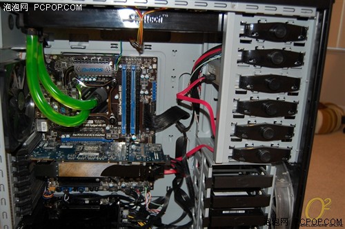 本来以外这么个大家伙只有少部分机箱才能装,但是没想到普通的ATX也可以,不过前提是要牺牲顶部5.25寸光驱位置。上面途中为了整洁用了两根较短的水冷管,原配水冷管的尺寸还是很长的可以安装在机箱内部如果不支持放在外部也可以。