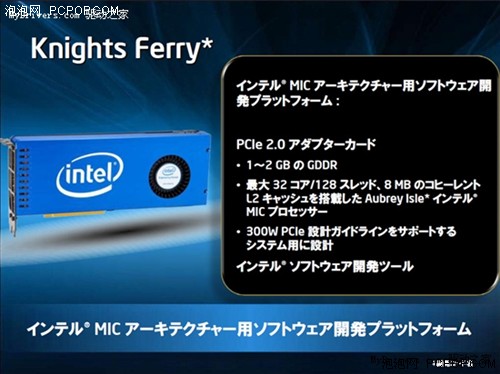 实际上,Knights Ferry现在已经发放给了部分HPC超级计算机平台开发人员。不过,这是一款不会公开销售的纯测试产品。MIC架构HPC应用的首款商用产品将名为Knights Corner,采用22nm工艺,集成50个以上的IA架构核心。