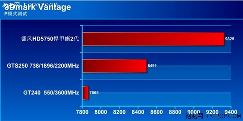 在3Dmark vantag P模式的对比测试成绩中,HD5750的优势完全盖过GTS250,此外在温度、功耗等测试中的优势同样明显。