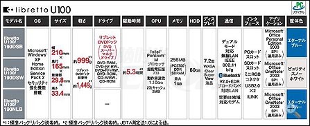 U100系列详细可分为三个型号,可参见下图表格。在如此轻便的机身中容纳的是Intel Pentium-M 733 (1.1GHz 2MB L2