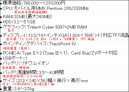 Pentium MMX 200/233MHz 处理器,32MB内存以及3.2/5.1G的硬盘。该笔记本的液晶显示器分模式已经达到XGA(1024 X