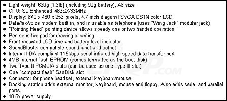 486SX(33MHz),8MB的内存,没有采用硬盘,却采用了现在我们统称的闪存,内置4MB的储存容量。这款机型内置电池,外观采用全铝合金制造,整体重量仅为630g。这款笔记本电脑的扩展性非常的好,甚至插上电话线能够直接当电话使用。