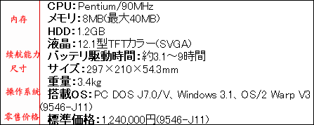 80386(20MHz),1MB的板载内存(最大扩充为13MB),120MB的硬盘。显示器为24厘米、256色TFT显示器,分辨率为640 X