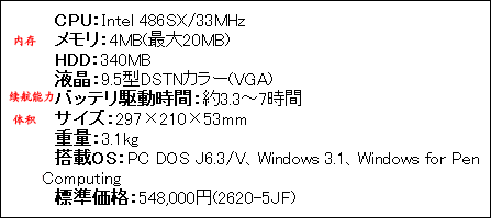 486SX(33MHz),4MB内存(最大扩充为20MB),340MB的内置硬盘。这款笔记本的液晶屏幕可以翻转,采用了9.5寸、分辨率为640 X