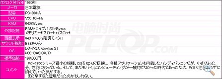 98”。它配备了V50(10MHz)处理器,640K的物理内存(最高添加为1.25MB),没有配备硬盘。液晶显示器采用的是黑白的VGA显示器,整机重量仅为1.1公斤,拥有7-8小时的续航能力。