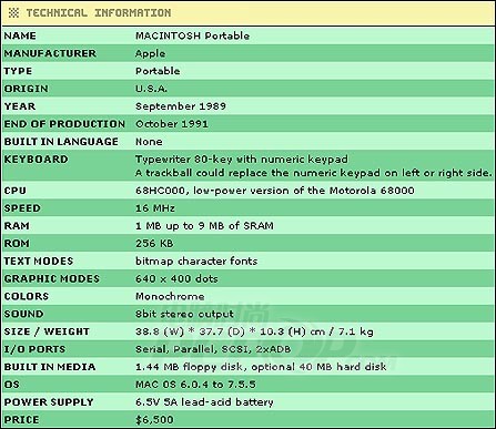 1989年9月,这是苹果公司面向用户推出的第一款笔记本电脑。这款电脑在当时推出市场的时候性能大大超出了其它便携电脑(笔记本电脑)。它采用了68HC000处理器,这是Motorola