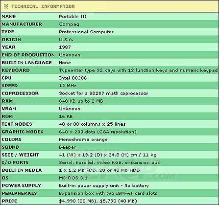 80286(12MHz)处理器,640K内存(2MB最大),内置硬盘(20/40MB)并且可以与软盘互换。这款便携电脑采用了单色显示器,分辨率从真正意义上提升到了640