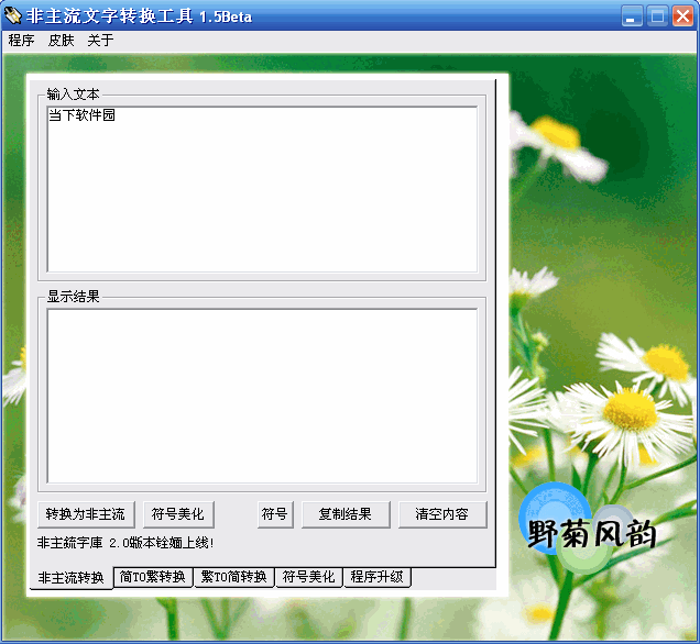 网络上时兴一些潮流的文字,许多网友称之为"非主流"或"火星文"文字.这些文字其实是将简体中文进行繁体化、异体变形所得。很多网友费了很多力气才在输入法字库内把这些文字一个一个找出来。现在,告别找“非主流文字”要翻页N遍的历史了!本工作室的最新软件:“非主流字体转换工具 1.0”便能帮助您打出很多这种文字!“非主流字体转换工具”内置海量字库,搜集了网络上最新的非主流文字。它还内置了符号软键盘,可以帮助您添加很多装饰符号!同时,该软件内置自动升级程序LiveUpdater1.0,能自动帮助您下载最新版的字库!“非主流字体转换工具”集数大功能为一体,内置10 万字常用字库,安装程序所占空间仅为2.8MB!