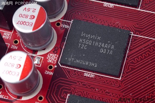 显存方面,镭风6850采用非常流行的的现代 GD5方案,8颗32Mx32bit的GDDR5显存组成1024MB/256bit的规格,预设频率为4000MHz,仍为爱超频的玩家留有丰富的超频空间。