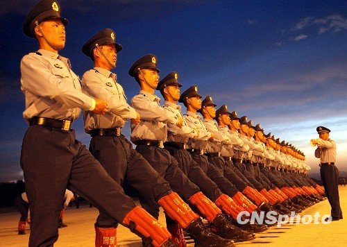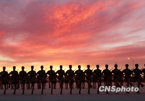 9月中旬,建国六十周年国庆阅兵进入冲刺阶段,位于北京郊区阅兵村中的空降兵方队官兵们正披着彩霞紧张训练。
