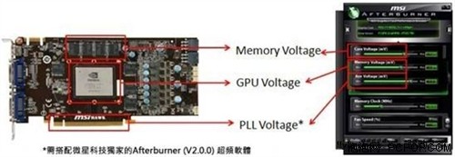另外,微星首创的三重加压技术,可以配合微星的新版显卡工具Afterburner 2.0.0调节核心电压、显存电压、PLL(锁相环)电压。与此同时,她还支持APS主动相数切换技术和Points V-Check Point电压量测点,此技术能够根据显卡负载自动调整,节约功耗做到低碳环保,而后者通过电压量测点,简单运用三用电表即可轻松掌握所有的电压状态,完整掌握超频时的各项信息,让超频变得更轻松、更容易。这款显卡虽然才刚发布,国外的骨灰玩家就提前拿到这块卡,印尼著名超频玩家Hazzan正是利用这块N460GTX Hawk,在风冷条件下也将核心频率超到了1GHz,可谓出尽风头。