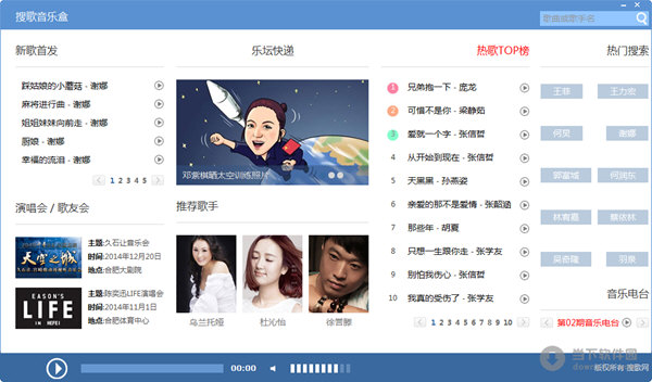 软件名称:电脑搜歌软件|搜歌音乐盒 V1.10 官方版 软件大小:673KB 软件语言:简体中文 软件类别:国产软件/免费软件/搜索引擎 运行环境:Win2003, WinXP, Win2000, Vista, Win7 软件简介: 搜歌音乐盒绝对是音乐发烧友的神器,他让你在电脑上动动手指就能快速搜索到符合你胃口的歌,拥有强大的搜索引擎,每天更新海量更新,拥有这个电脑搜歌软件。 电脑搜歌软件|搜歌音乐盒 V1.10 官方版 下载 电脑搜歌软件|搜歌音乐盒 V1.10 官方版 迅雷下载 下载页面:http://www.downxia.com/downinfo/52748.html