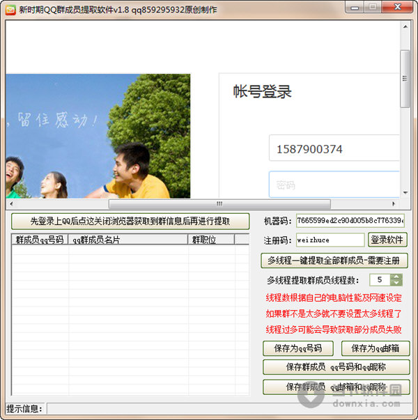 软件名称:新时期QQ群成员提取软件|新时期QQ群成员提取软件 V1.8 绿色免费版 软件大小:1343KB 软件语言:简体中文 软件类别:国产软件/免费软件/QQ 专区 运行环境:Win2003, WinXP, Win2000, Vista, Win7 软件简介: 新时期QQ群成员提取软件是一个快速的QQ群成员提取软件,他支持批量的从QQ群中将所有成员的QQ号码采集出来,高速采集,便于营销推 广员使用。 新时期QQ群成员提取软件|新时期QQ群成员提取软件 V1.8 绿色免费版 下载 新时期QQ群成员提取软件|新时期QQ群成员提取软件 V1.8 绿色免费版 迅雷下载 下载页面:http://www.downxia.com/downinfo/52752.html