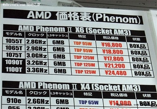 Phenom II X6 1065T 2.9GHz/95W盒装版本现已在日本秋叶原市场上开卖,含税售价18750-19480日元,约合人民币1490-1545元。