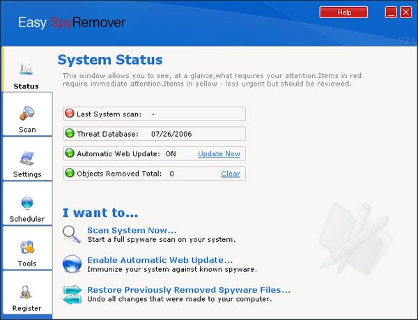 11、Easy SpyRemover V3.2 绿色特别版 软件大小:2.29 MB 软件语言:英文 软件类别:绿色软件/免费软件 运行环境:Win9X/WinXP/Win2000/ 软件简介: 可以专门为清除悄悄安装在你的电脑里的间谍程序而设计的一个计算机网络安全工具,可以帮助你快速的在系统组件中搜索已知的间谍程序的踪迹,并可以帮助你安全的清除他们,全面保护你的网络安全 register: L3RP-GYXR-C2HR-YXKE-8N7Y