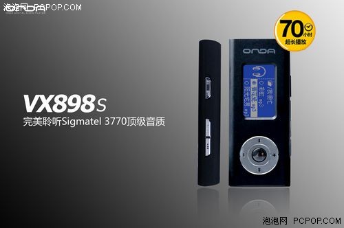 昂达新品VX898S采用了Sigmatel芯片的音质力作Sigmatel 3770,这也是目前纯音乐MP3中音质最为顶级的高端音频芯片,VX898S音质自然无以伦比,此外还支持APE/FLAC无损压缩音乐格式与多种实用音效,整体改善机器听感。1.0英寸CSTN真彩屏的运用,使MP3在操作中配合方向键操作直观方便。4GB可以存储高达1000首高品质歌曲、支持多种播放模式。支持快速充电,可连续播放音乐高达70小时,完全解除了对续航的担忧。无线车载发射功能,以获得更清爽、更便捷的聆听分享体验。FM收音、电子书、高清录音、复读、多任务操作等实用功能应有尽有。